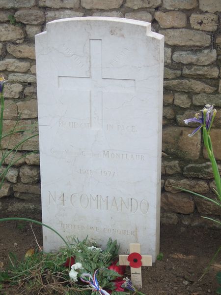 Het landingsvaartuig waar hij in zat werd getroffen door een Duitse granaat. De munitie achterin het vaartuig ontplofte en 3 commando’s waren op slag dood, Guy de Montlaur raakte gewond in zijn gezicht door granaatscherven. Het landingsvaartuig zonk en nog vier commando’s lieten het leven. De overgebleven commando’s klauterde naar de enorme antitankpalen die langs de stranden in de grond waren geslagen. Ze beklommen de palen en kwamen zo bij de Oranjemolen terecht. Zijn vriend, commando Guy Vourch die deze foto vlak daarna genomen heeft zei over zijn houding tijdens de landing: “Gewond, aan mijn zijde, weigerde hij zich te laten evacueren. Zijn moed grensde aan onbeschaamdheid. Hij was vernederend voor de vijand“. Guy ontving zeven onderscheidingen en het Légion d’honneur.